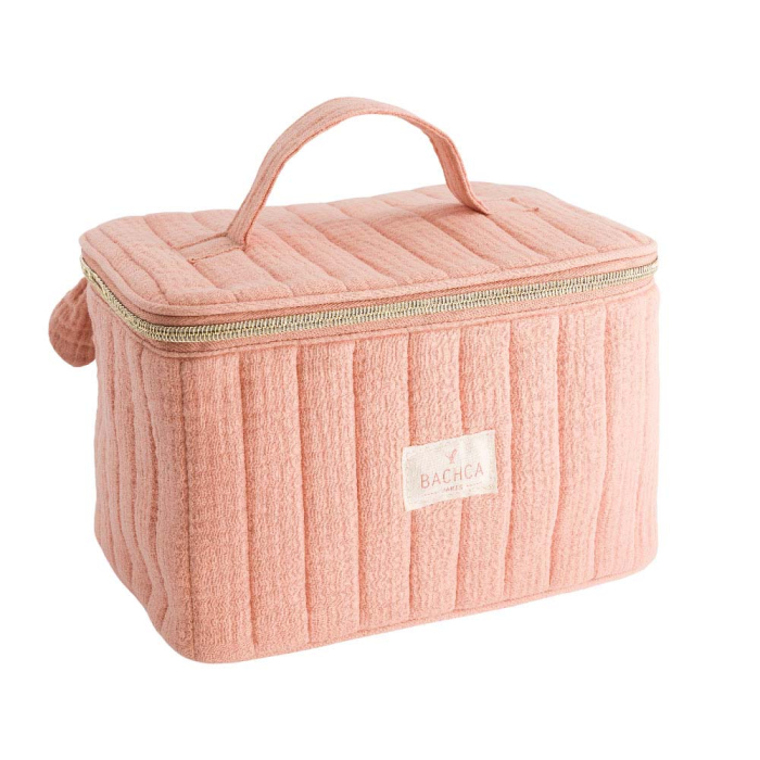 Vanity case Bachca. Pour ranger tous vos soins de beauté, vos accessoires de maquillage ou les petites affaires de bébé.Texture douce en double gaze de coton matelassée Doublure en coton enduit déperlant. Avec une poche intérieure , un zip doré et une tirette nœud. Dimensions : 26 x 20 x 18 cm